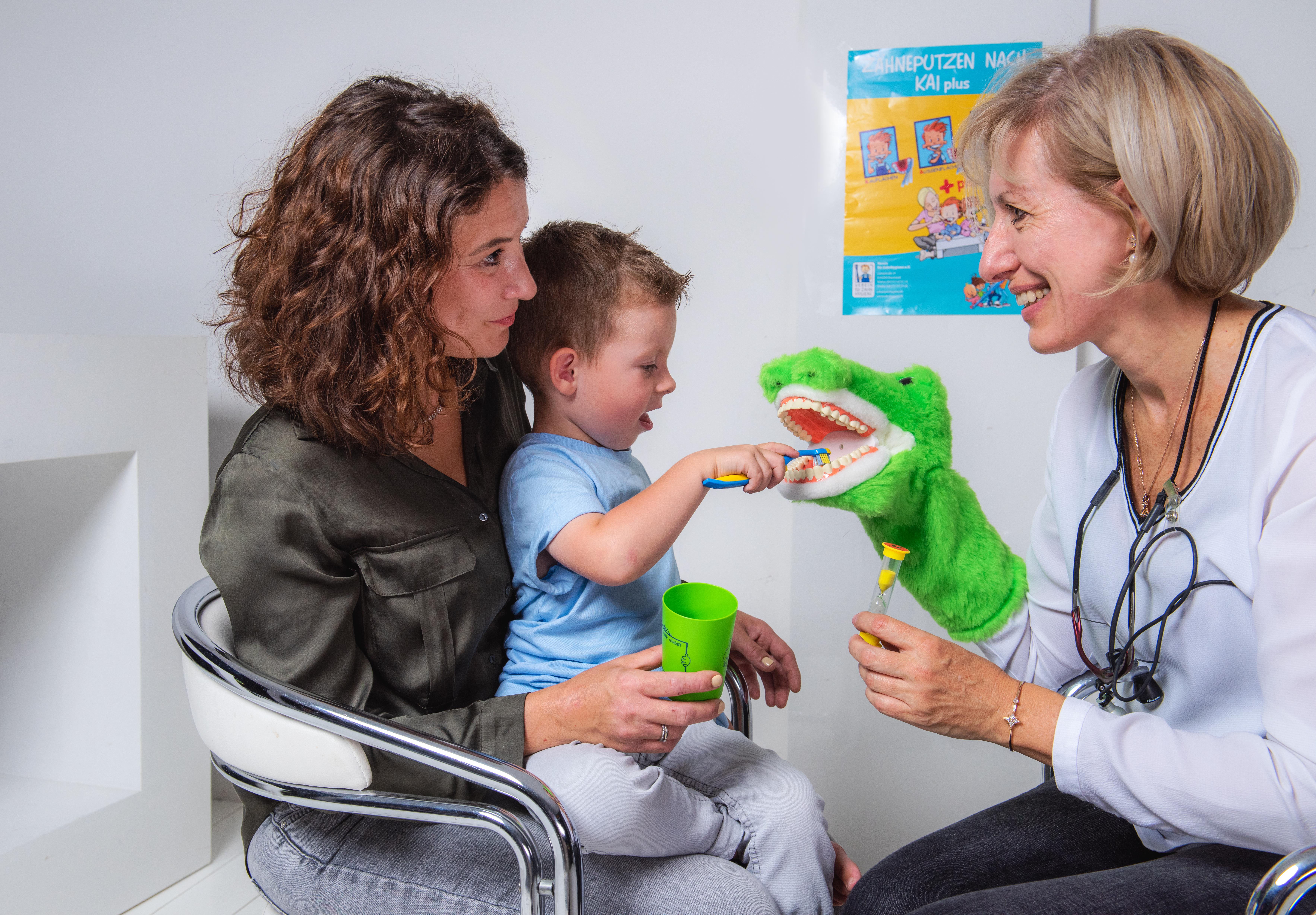 Das Foto zeigt eine Ärztin mit Krokodil in der Hand und Mutter mit Kind auf dem Schoß, Foto: Gesundheitsamt Rastatt