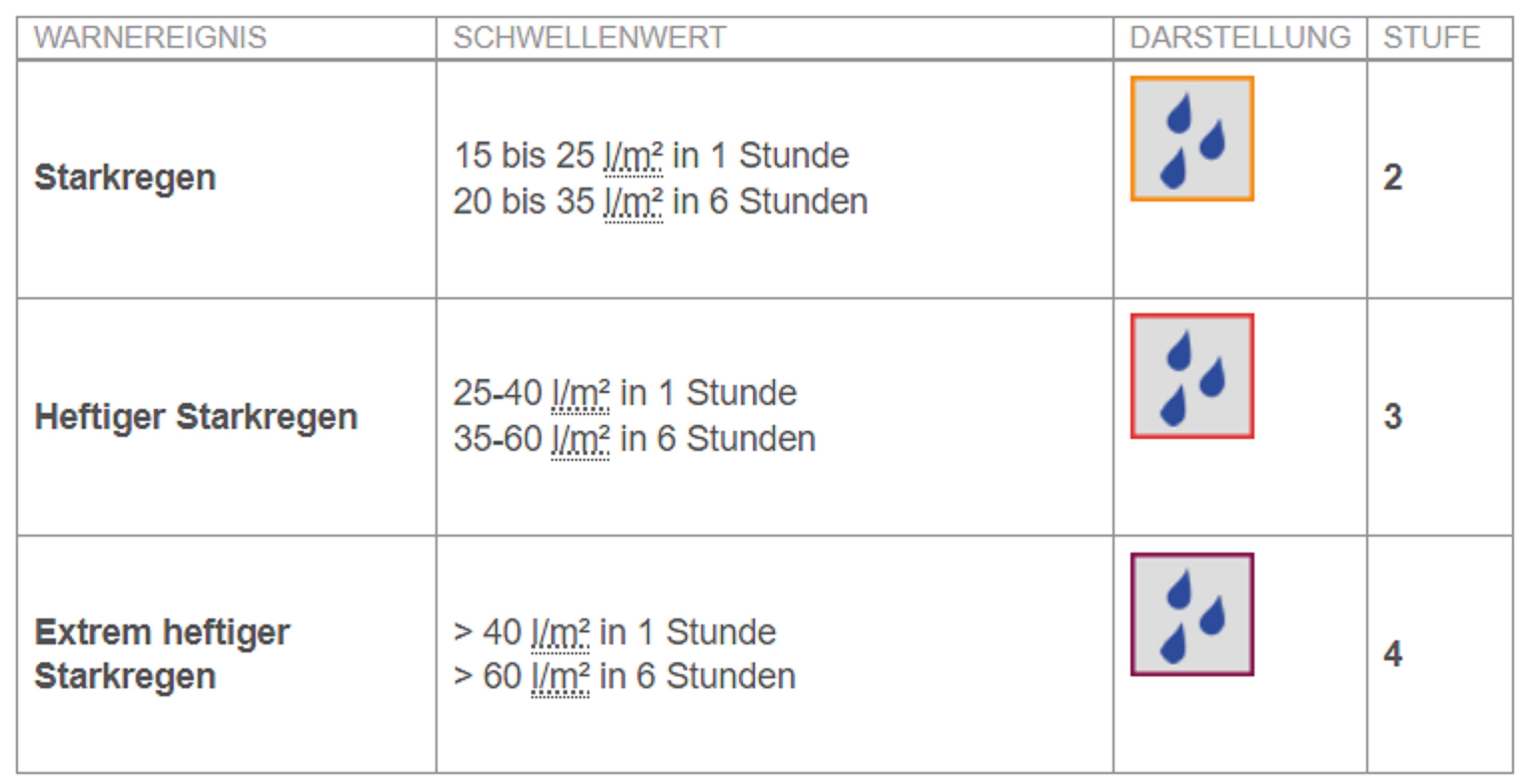 Der DWD warnt in drei Stufen vor Starkregenereignissen: