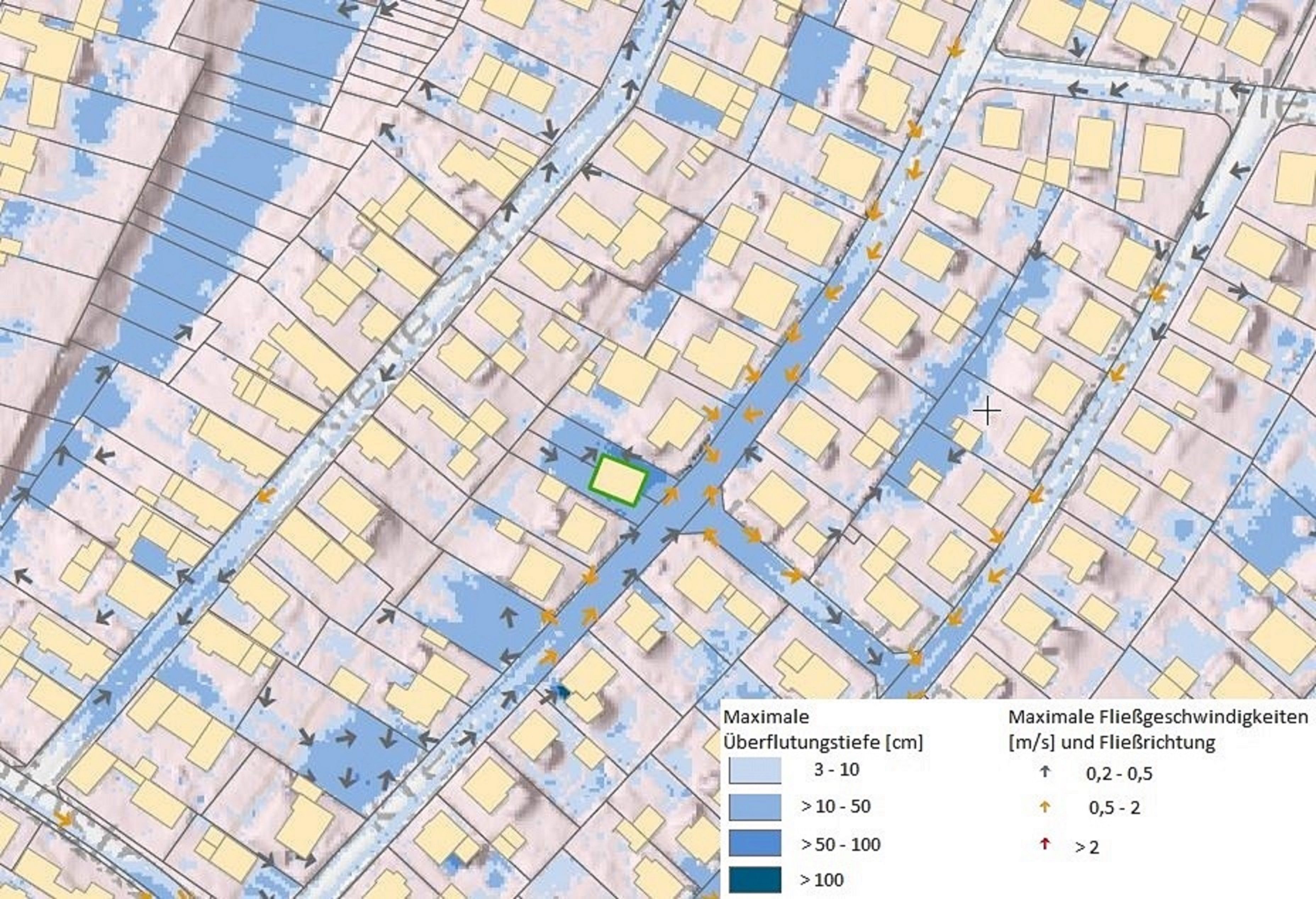 Als Ergebnis erhält man Starkregengefahrenkarten mit der maximalen Überflutungstiefe und -ausdehnung oder auch der Fließgeschwindigkeit und -richtung. Diese Karten sind die Grundlage für die spätere Risikobetrachtung und das kommunale Handlungskonzept.