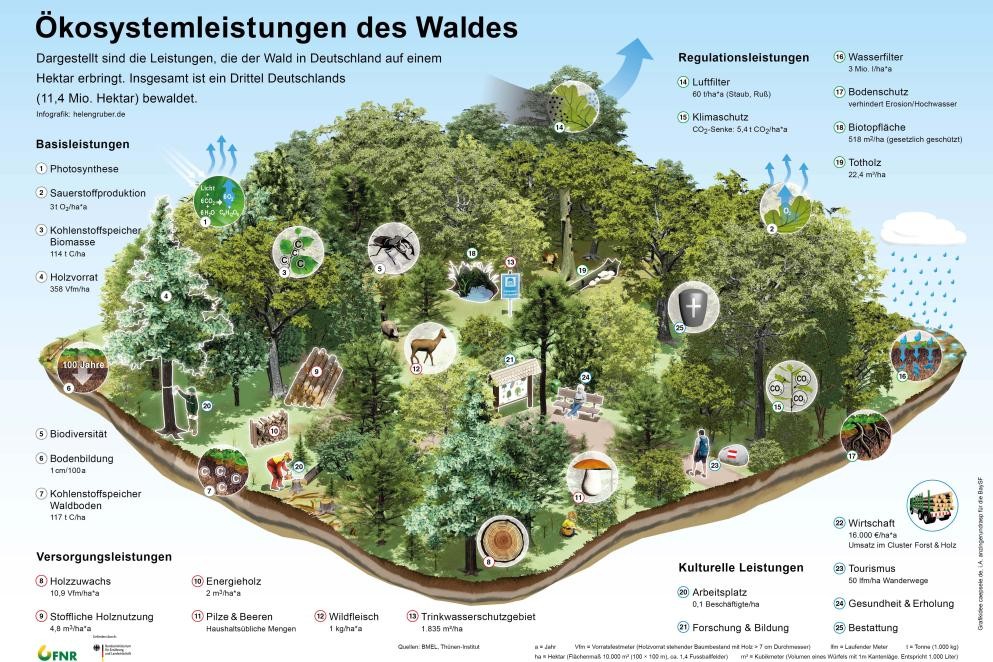 Die Waldfläche in Deutschland beträgt derzeit rund 11,4 Millionen Hektar, was etwa einem Drittel der Gesamtfläche des Landes entspricht. Die Wälder erfüllen verschiedenste ökologische Funktionen und sind wichtig für eine intakte Umwelt. Abgesehen davon sind sie auch von wirtschaftlicher Bedeutung. Sie stellen unverzichtbare Rohstoffe wie Holz und andere Naturmaterialien bereit und bilden die Grundlage für die Beschäftigung von mehr als 1 Million Menschen im Cluster „Forst und Holz“.