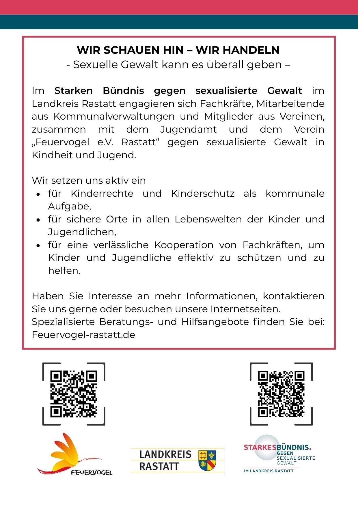 Gemeinsam gegen sexualisierte Gewalt: im Schulterschluss nehmen die Landkreisverwaltung mit der Fachberatungsstelle Feuervogel Rastatt e.V. am Förderprojekt “Starke Bündnisse gegen sexualisierte Gewalt” in Baden-Württemberg teil. Ziel ist es, im Landkreis Rastatt ein Bündnis zu etablieren, um die vorhandenen Angebote, Akteure, Strukturen und Netzwerke, die im Themenfeld “Schutz vor sexualisierter Gewalt” bestehen und arbeiten, zusammenzuführen.