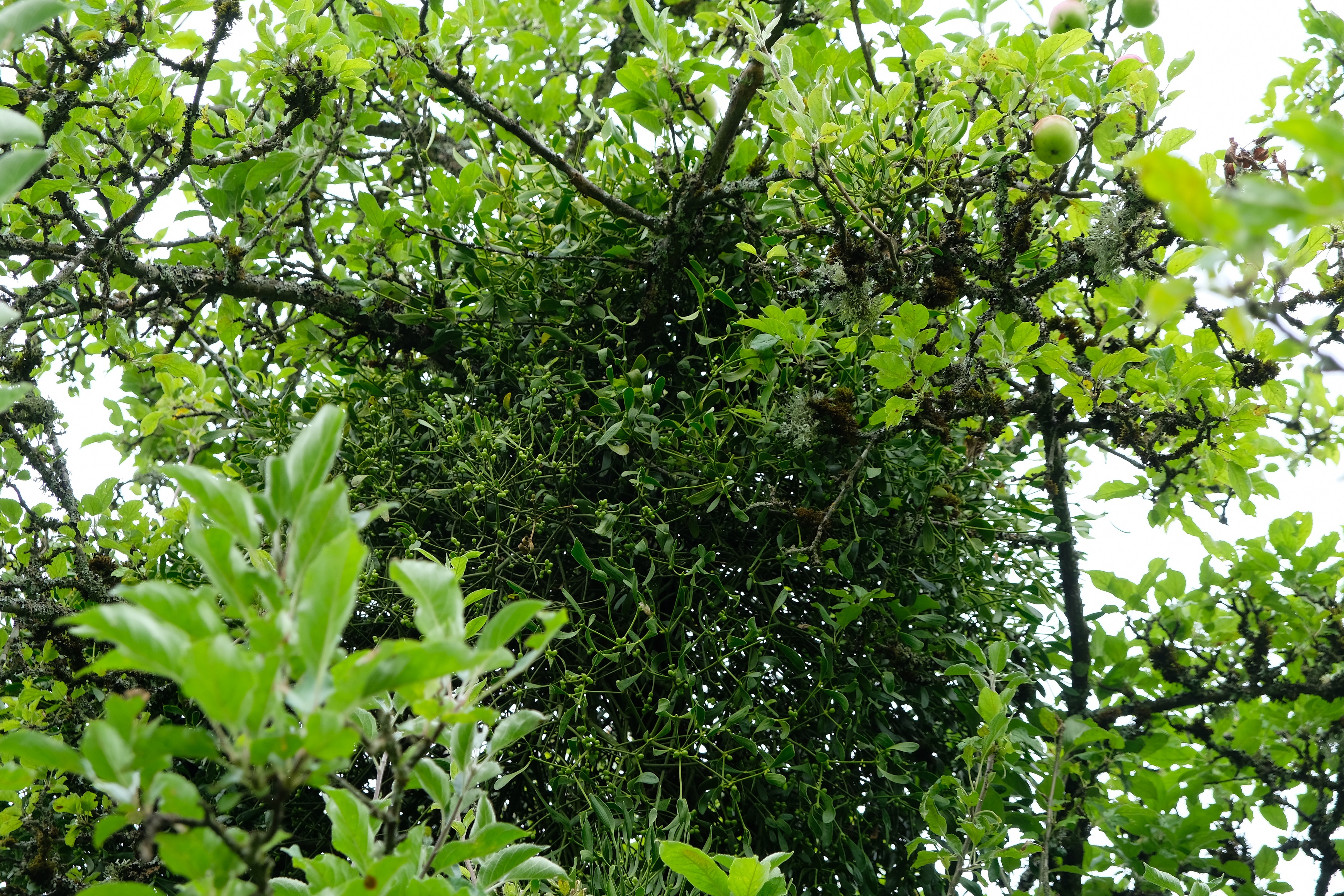 Die Obst- und Gartenbauberatung des Landkreises empfiehlt daher dringend das gründliche Entfernen der Misteln beim Baumschnitt. „Dabei ist es am besten, die jungen Mistelpflanzen im Zweiblattstadium zu erwischen. Dann kann noch mit einer Kerbe ins Holz die ganze Jungpflanze entfernt werden und die Wunde heilt wieder zu“, erläutert Fachberaterin Dütsch-Weiß. Wenn das Wachstum fortgeschritten ist, gehen auch die Wurzeln tiefer und für eine vollständige Beseitigung müssen ganze Äste bis 30 Zentimeter hinter der Mistel-Ansatzstelle entfernt werden. Dütsch-Weiß: „Das ist oftmals kaum möglich ohne den Baum zu zerstören. Es ist allerdings hilfreich, alle sichtbaren Misteln herauszuschneiden, so gründlich es geht.“ Vor allem Büsche mit Beeren müssen raus, damit die weitere Verbreitung verhindert wird. Wenn sie nicht vollständig entfernt werden können, treiben sie zwar wieder aus, aber es dauert einige Jahre, bis erneut eine Blüte gebildet wird.