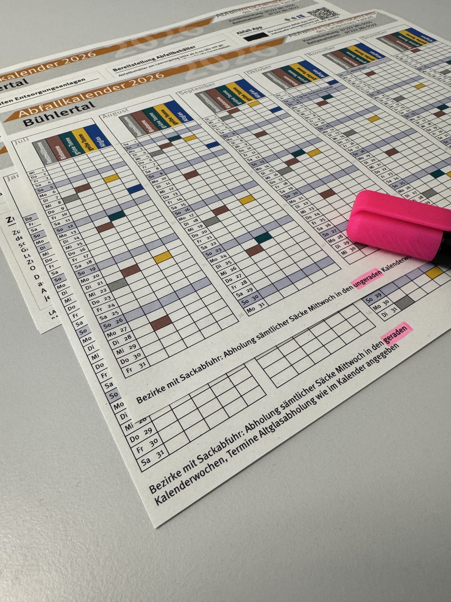 Wie der Abfallwirtschaftsbetrieb des Landkreises Rastatt mitteilt, befindet sich ein Druckfehler auf dem Abfallkalender von Bühlertal. Die Abholung sämtlicher Säcke (Sackabfuhr) findet mittwochs im ersten sowie im zweiten Halbjahr in den geraden Kalenderwochen statt.